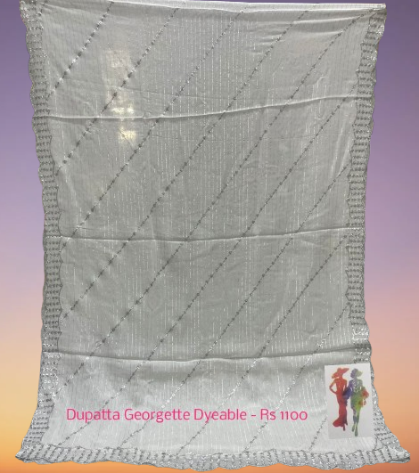 A Georgette Embroidery Diable Dupatta is a lightweight, sheer scarf or shawl made from georgette fabric and decorated with embroidery. It has a slightly crinkled texture and a graceful drape. Ideal for festive and formal wear due to its elegant fall. It is common in traditional Indian outfits like salwar suits, lehenga cholis, or even paired with anarkalis.