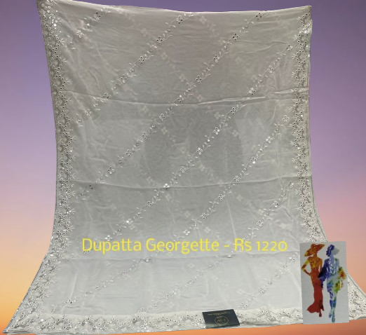 A Georgette Embroidery Diable Dupatta is a lightweight, sheer scarf or shawl made from georgette fabric and decorated with embroidery. It has a slightly crinkled texture and a graceful drape. Ideal for festive and formal wear due to its elegant fall. It is common in traditional Indian outfits like salwar suits, lehenga cholis, or even paired with anarkalis.